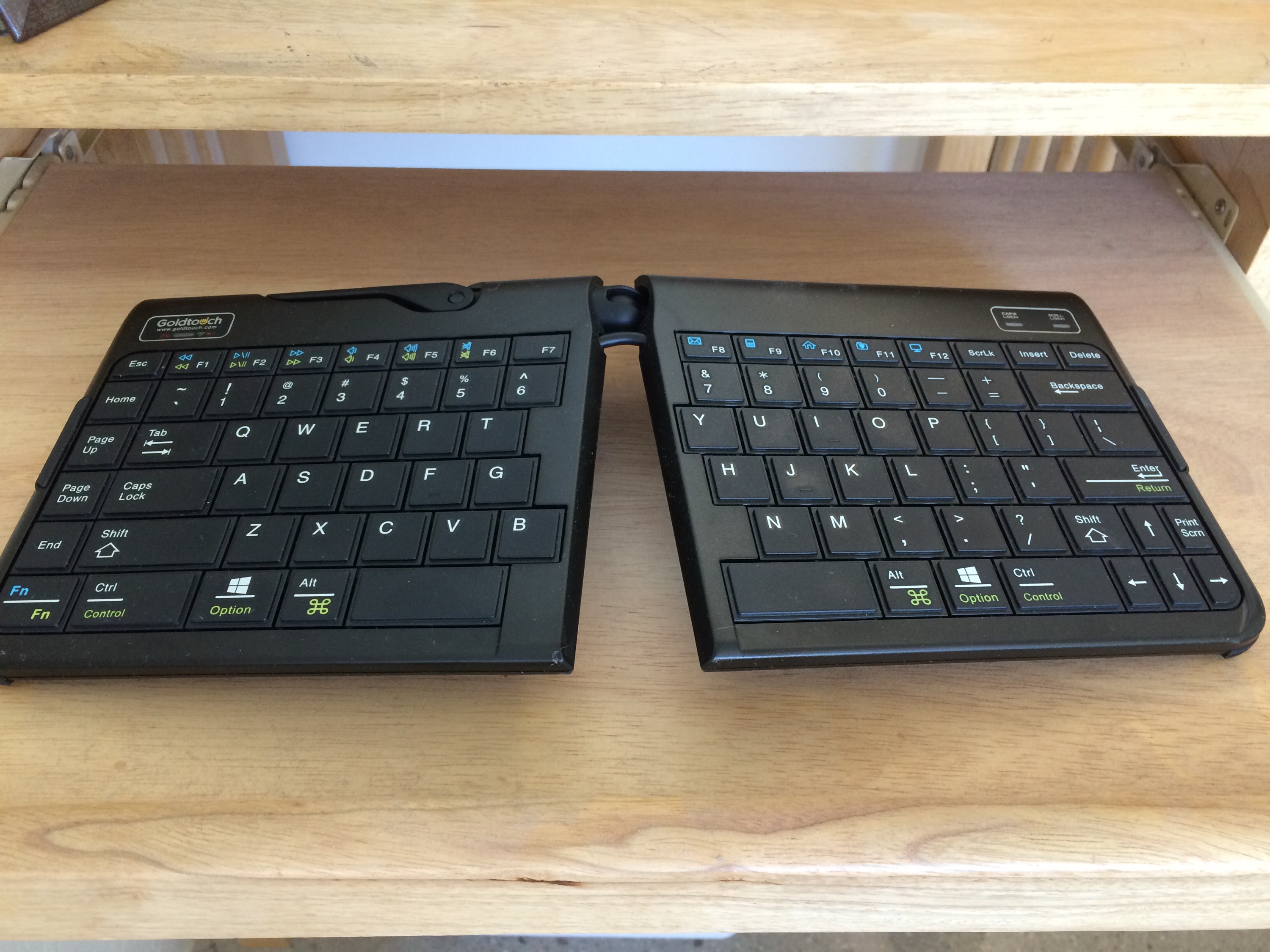 • The second thing – which again, I didn’t realize how neat it was until I tried it – is what they refer to as  a the “tent” angle. This keyboard can be adjusted so that the middle of the keyboard is higher than the edges. This is hard to explain, so just picture a tent. It’s like that. I’m not a doctor or a physical therapist or anything, but it makes sense that this angle would alleviate pressure on the wrists, arms, and shoulders. A regular keyboard forces you to twist your shoulders/arms/wrists to align your hands with the keys that are directly in front of you. This keyboard twists itself to align with the natural position of your shoulders/arms/wrists. Big difference. Love love love. Go to the Goldtouch website for more pics and info.