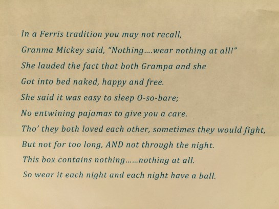 Sleep naked. While Grandma Mickey was an elephant-collecting, flag-waving, conservative Republican, she most certainly was not the epitome of a traditional 50’s housewife. I knew she was outspoken and that we learned “bad” language from her, but I didn’t learn about the sleeping naked rule until well after my grandma had passed. Just before my wedding in 2010, my aunt wrote me a poem as a gift: