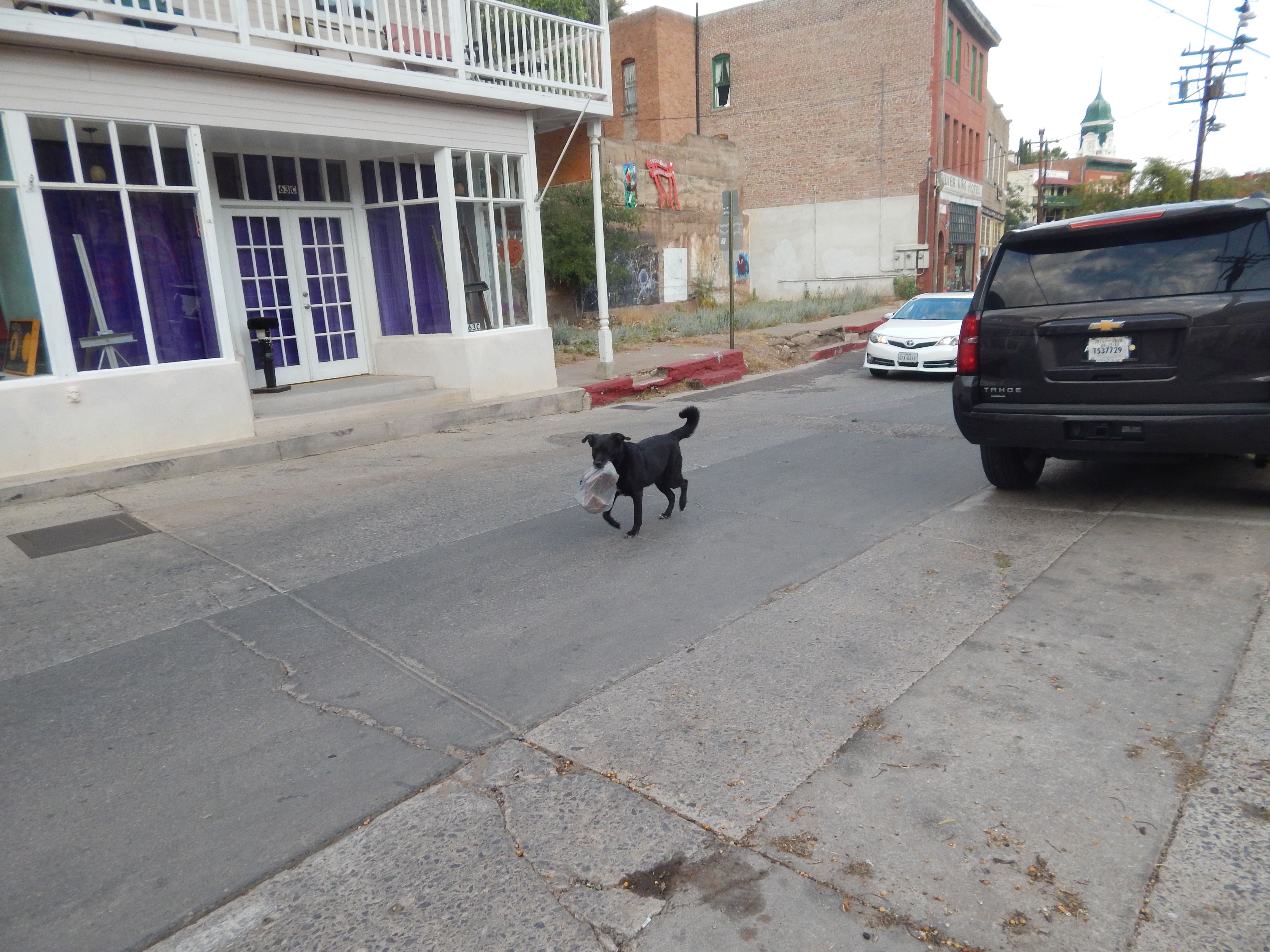 This dog was very pleased with the bag of food he found!