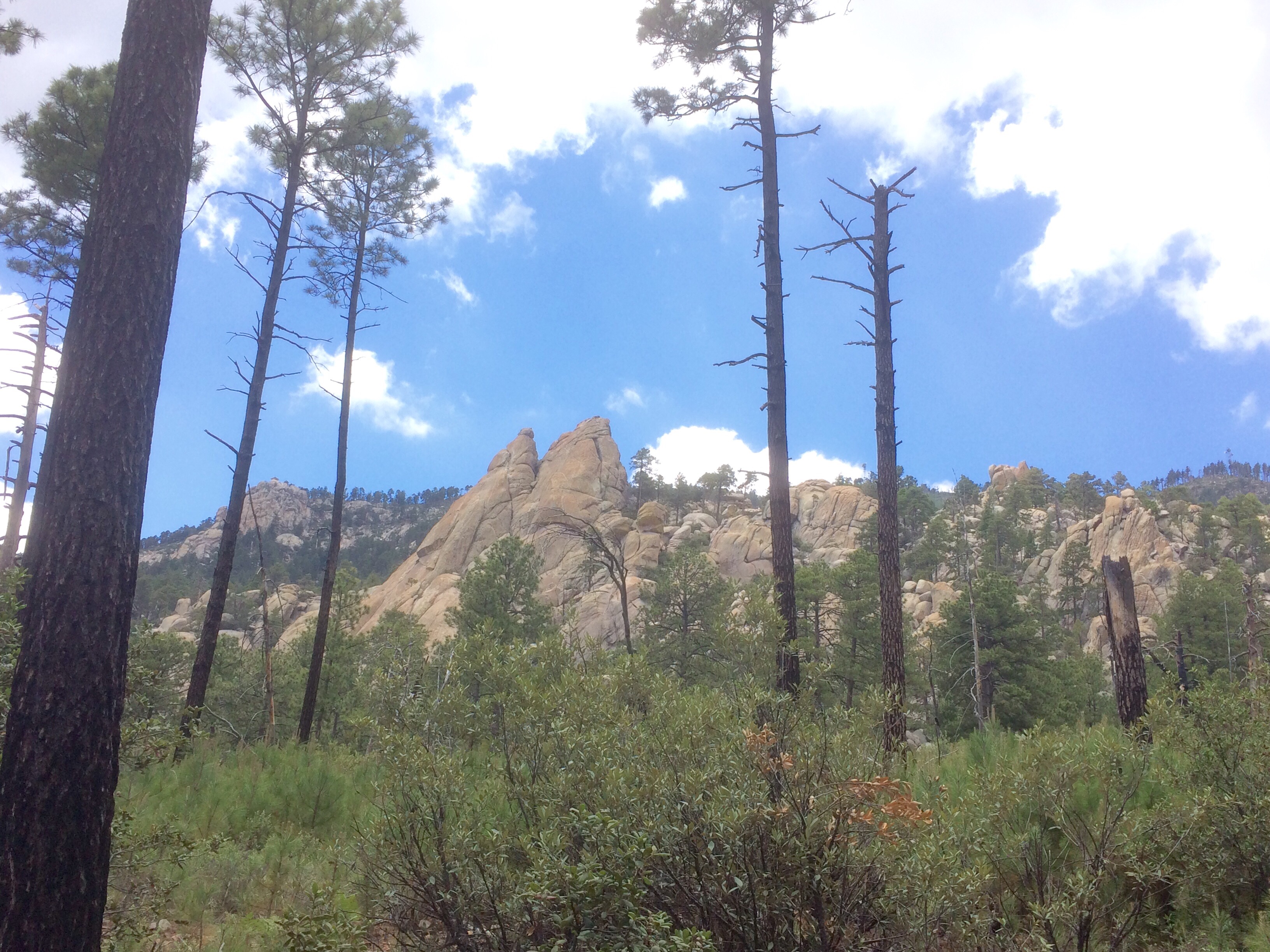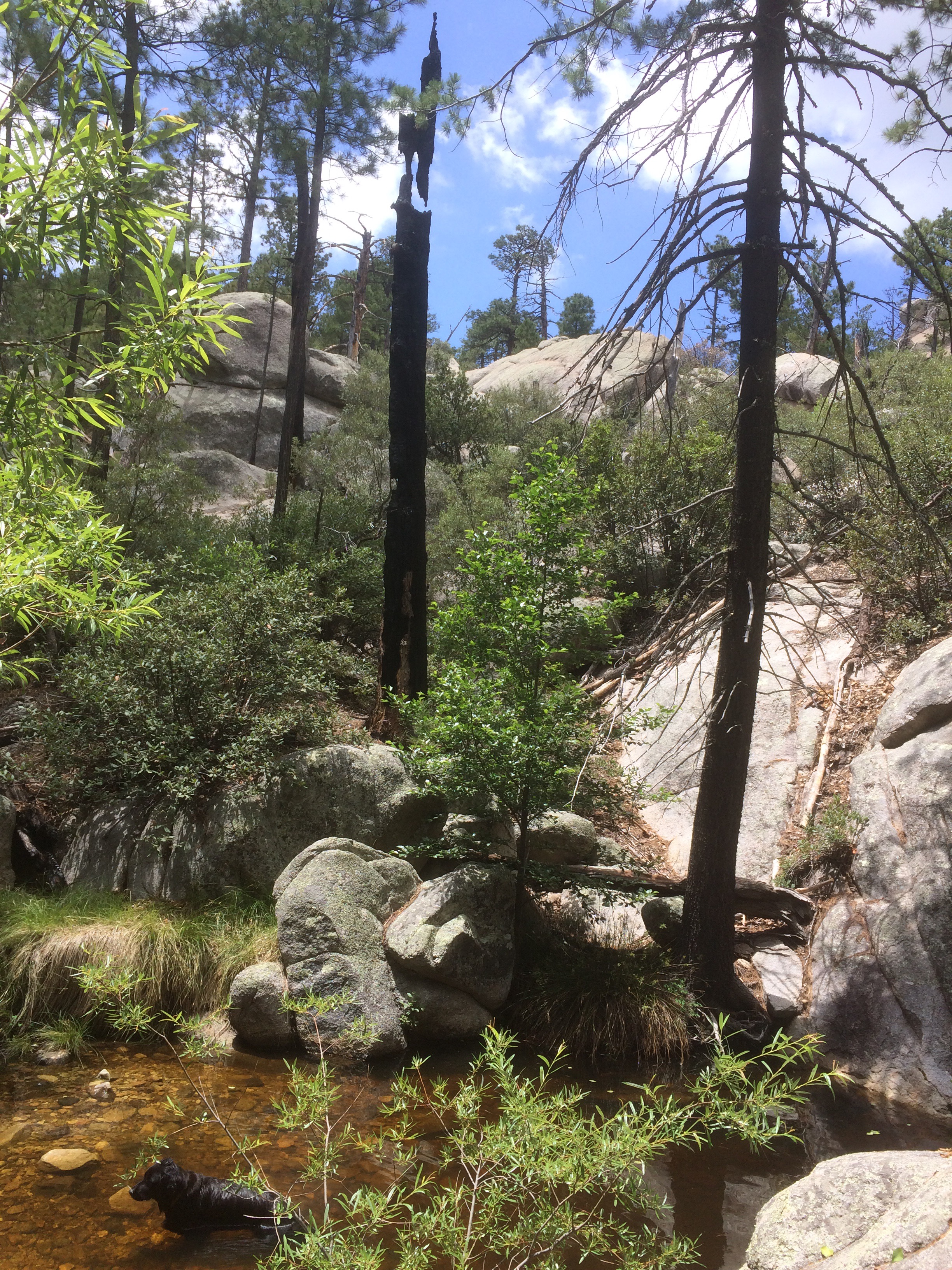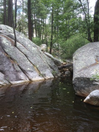 We hiked the Marshall Gulch trail to the Wilderness of Rocks trail, and I highly recommend you take a friend on this hike soon. It’s at the top of Mount Lemmon which gives a heavenly reprieve from the scorching desert in the summer. Make a day of it. Bring a book and a snack or even lunch. There are small pools of water you could even wade in or jump in! Marshall Gulch is a steady, but gradual climb upwards through the forest and along a stream. Incredibly idyllic, especially once you get past the campers who wandered their way in.